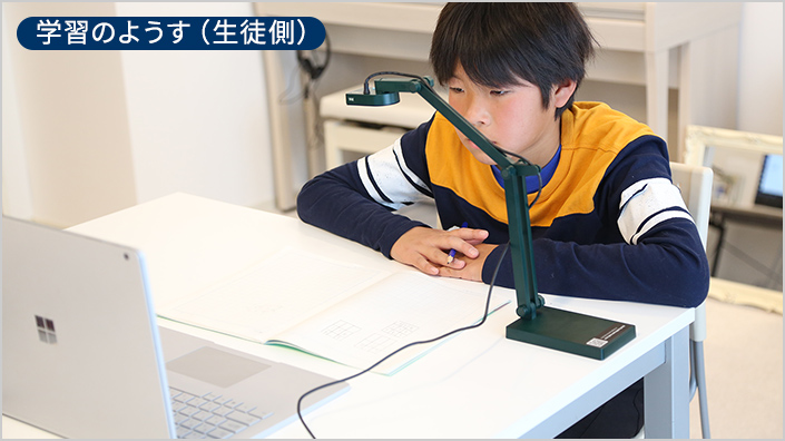 WEBカメラでお互いに顔を見ながら、さらに、手元カメラで教材やノートを確認し合いながら授業を進めます。生徒が問題を解くようすを講師が確認できるので、対面授業に限りなく近い授業が可能になります。